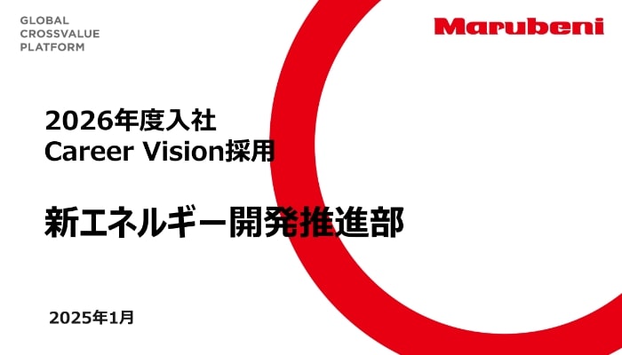 当社が培ってきたエネルギー分野の実績を活用し、より競争力の高い案件を選択し、国内外の幅広い関係者と協業しながら、丸紅のグリーン戦略でも掲げるグリーンのトップランナーを目指して、新エネルギー分野のサプライチェーン構築に邁進しています。新エネルギーの社会実装が目前に迫る中、脱炭素の実現に向けて、数々の課題を乗り越えて、これから立ち上がる新エネルギー市場を一緒に作り上げる仲間を募集しています!