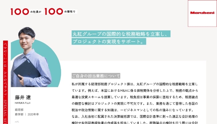 丸紅・経理部員は、監査法人・税理士法人・弁護士法人等との折衝・協業や営業部等との議論を通じて、会計・税務の専門性を高めることができます。また、単に定型業務を「こなす」のではなく、自分なりの創意工夫により業務をより良い方向へと変えていく発想力や行動力を常に求められる環境において、これらの能力を磨くことができます。